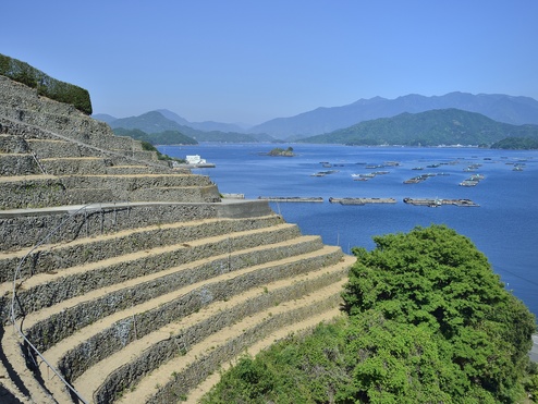 宇和海に突き出した三浦半島にある段畑。山の斜面に石垣積の段畑が造られ、傾斜は30度以上、頂上は海抜80mに達している。眼前の海と相まった段畑の景観は絶景で、下から見上げると天上に続く階段のように見える。