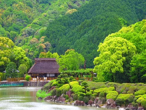 南楽園は、総面積約15万3千㎡を誇る四国最大規模の日本庭園。上池・下池を中心とする池泉回遊式日本庭園で、「山・里・町・海」を映す景観と、花菖蒲3万株や梅・桜、紅葉など四季の彩りが魅力である。1989年に日本の都市公園100選に選定された。