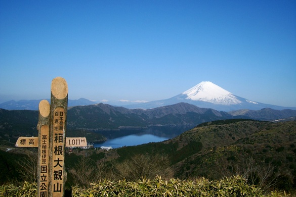 箱根町と湯河原町の境にある大観山は、標高1,015mの高みに立つ展望地。小田原方面から続く「アネスト岩田 ターンパイク箱根」の終点(大観山側)に展望台が設けられており、ドライブのクライマックスにふさわしい“見晴らしのご褒美”が待っている。